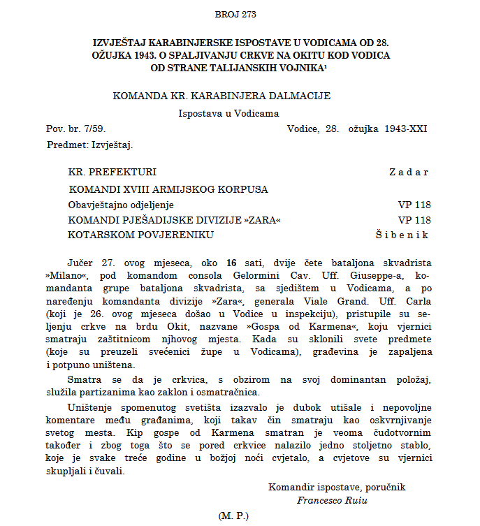 Zahvaljujući istraživanju Dinka Križana Vučka i izvješću karabinjerske ispostave u Vodicama, otkriveni su novi detalji o jednom od najtragičnijih događaja u povijesti vodičkog kraja – spaljivanju crkve Gospe od Karmela na brdu Okit od strane talijanske vojske 27. ožujka 1943. godine.