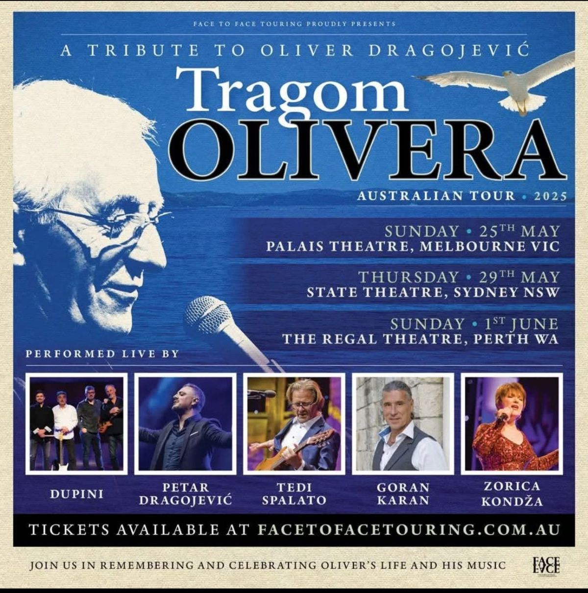 Nakon uspješno rasprodanih koncerata diljem Hrvatske, glazbeni hommage "Tragom Olivera" kreće na australsku turneju kako bi i naši iseljenici mogli ponovno osjetiti duh Oliverove glazbe. U sklopu turneje, koncerti će se održati u Melbourneu (25. svibnja), Sydneyju (29. svibnja) te Perthu (1. lipnja 2025.), a očekuje se i dodatni koncert u Sydneyju zbog iznimnog interesa publike.