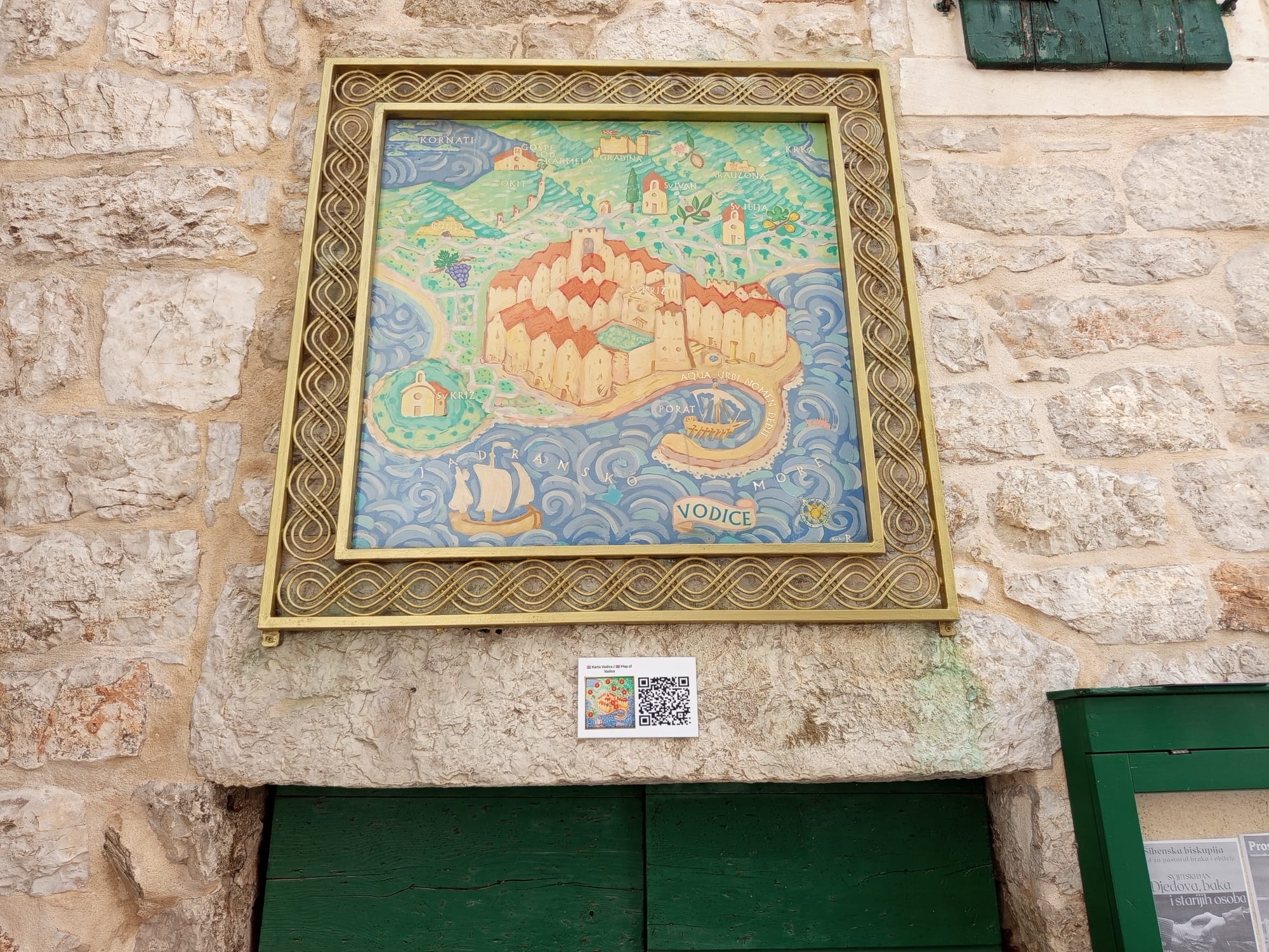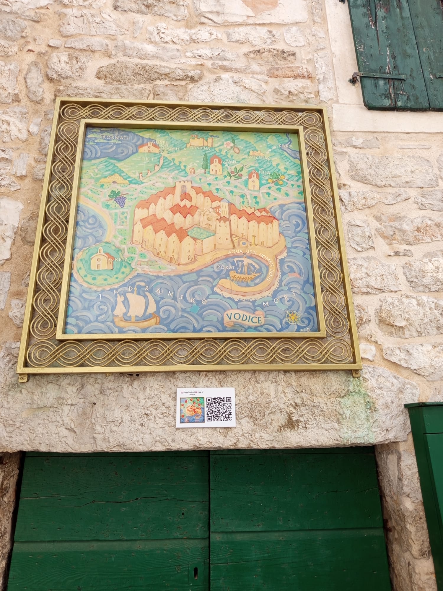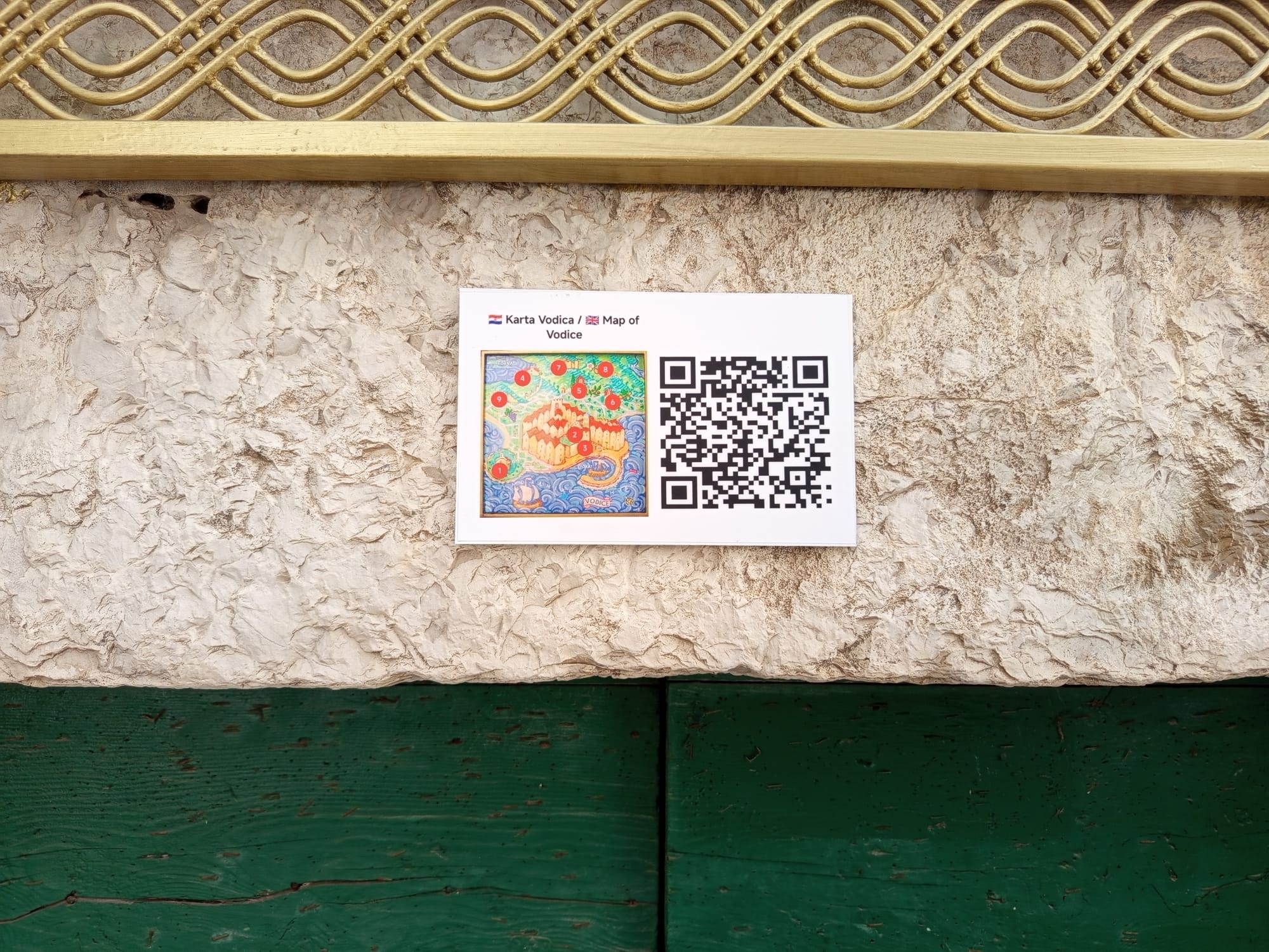 Karta/mapa se nalazi uz Zvonik nasuprot župne crkve. Uz nju je stavljena i pločica s QR kodom koji se može skenirati i tako otvoriti digitalno kartu na kojoj se mogu upoznati znamenitosti Vodica.