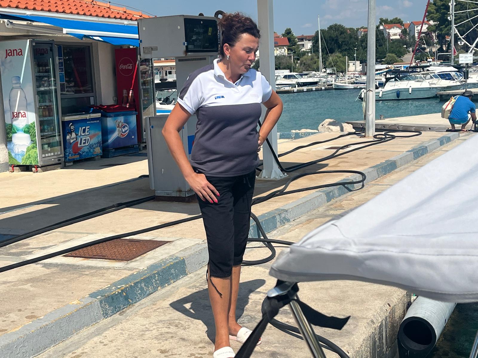 Odma san je doli na moru u Marini zapazija kako cila nasmijana na Ininoj pumpi sa smihon dočekuje brodove, trči, vezuje ih i nautičarima svu potrebnu pažnju i pomoć daje. Svima upada u oči ta njezina ljubaznost i volja da im pomogne pristati, rezervare napuniti i, ako zatriba, druge informacije dati. Srija san je u špici toplotnog vala kad je živa u termometru pokazivala skoro 42 grada. Ja skoro afana (onesvistija se), a ona radi tuta forca. Vidin jahtaši i vlasnici glisera viču joj: "Hvala, kapetanka!"
