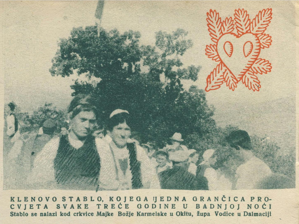 „Klenovo stablo, kojega jedna grančica procvjeta svake treće godine u Badnjoj noći; stablo se nalazi kod crkvice Majke Božje Karmelske u Okitu, župa Vodice u Dalmaciji.“