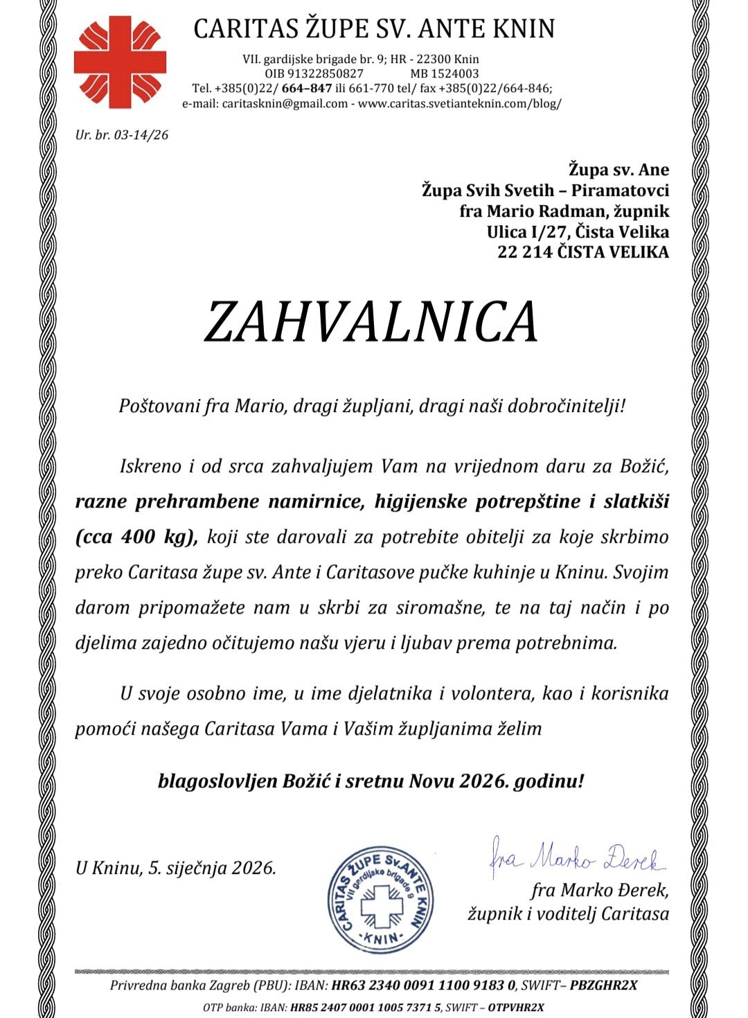 Župa sv. Ane u Čistoj Velikoj zaprimila je zahvalnicu Caritasa župe sv. Ante iz Knina za vrijedan božićni dar namijenjen obiteljima u potrebi o kojima skrbi Caritas.