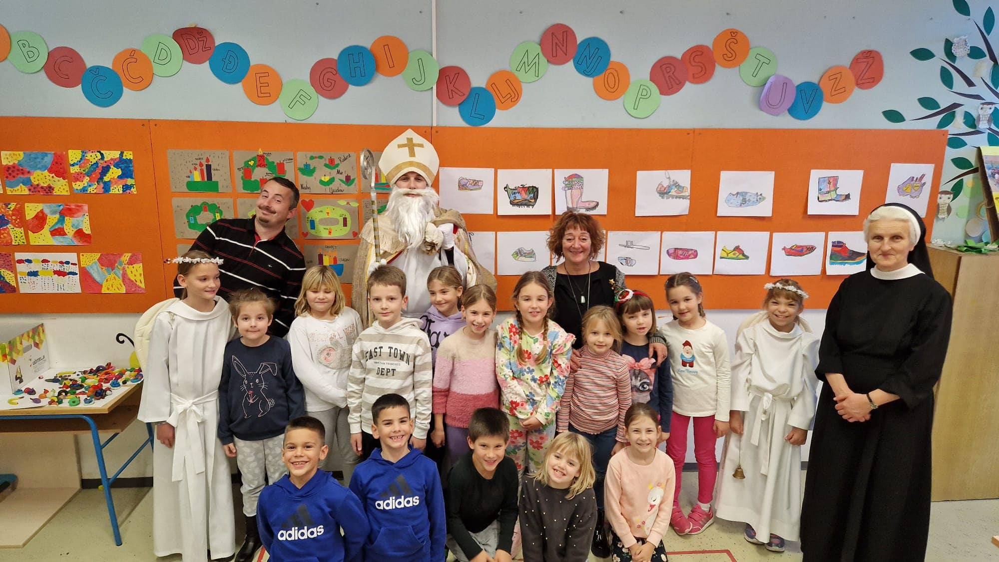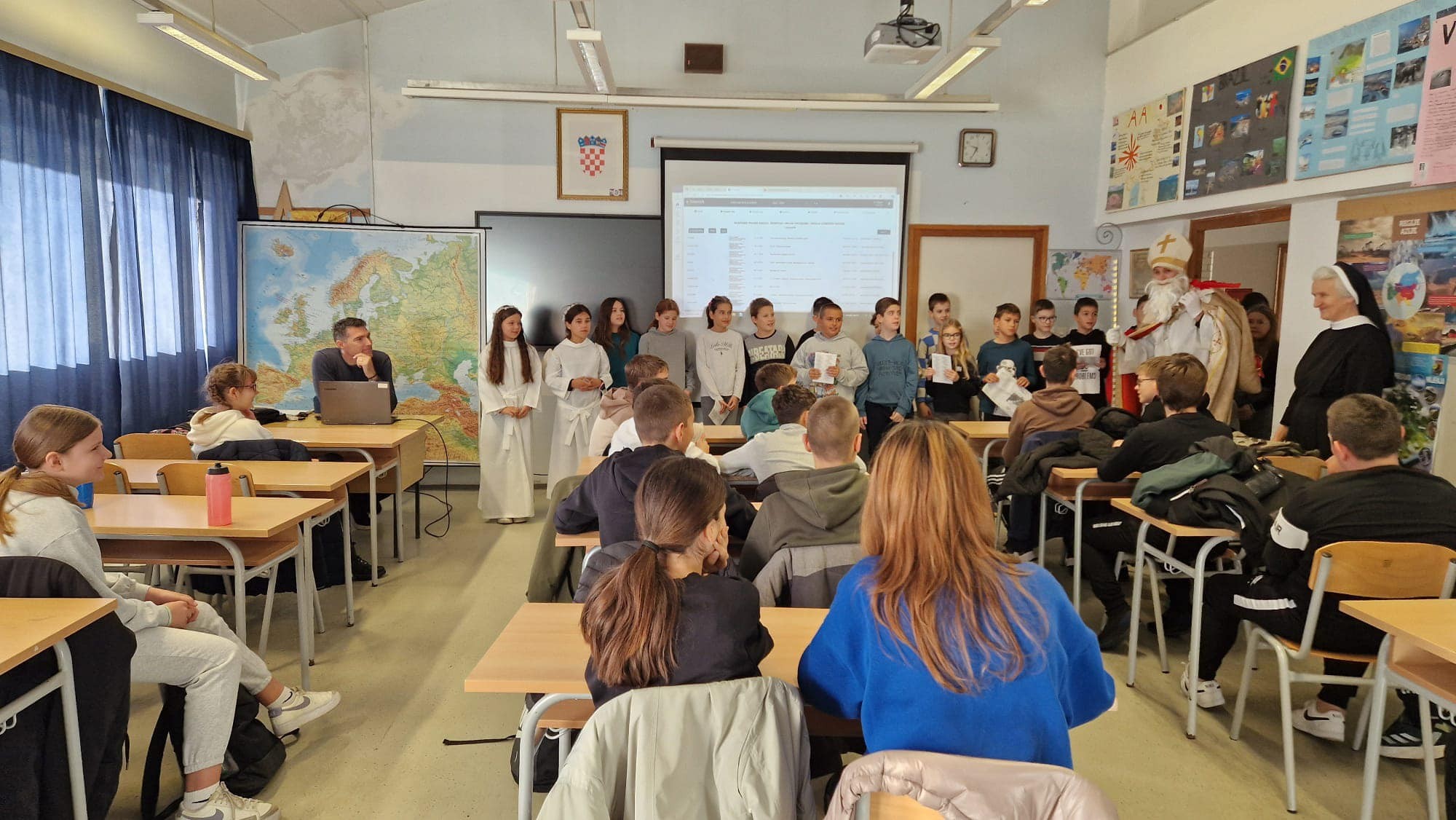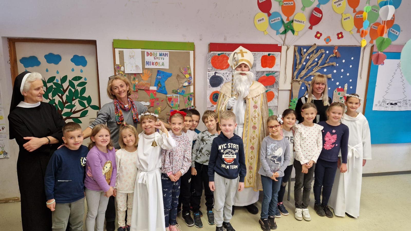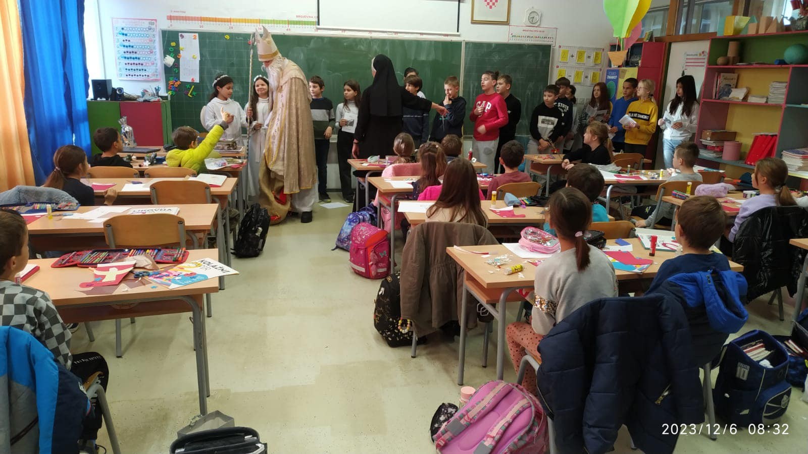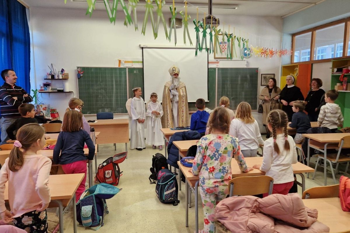 U jutarnjim satima, Sveti Nikola, u pratnji anđela i časne sestre Klare, prošetao je hodnicima škole, zaustavljajući se u učionicama kako bi podijelio male poklone svim učenicima. Djeca su s oduševljenjem dočekala svog posebnog gosta, čestitali su mu imendan i radosno sudjelovali u interakciji s njim. Odgovarali su na njegova pitanja, pjevali mu pjesme i veselo se fotografirali s njim, čime su stvorili nezaboravne uspomene.