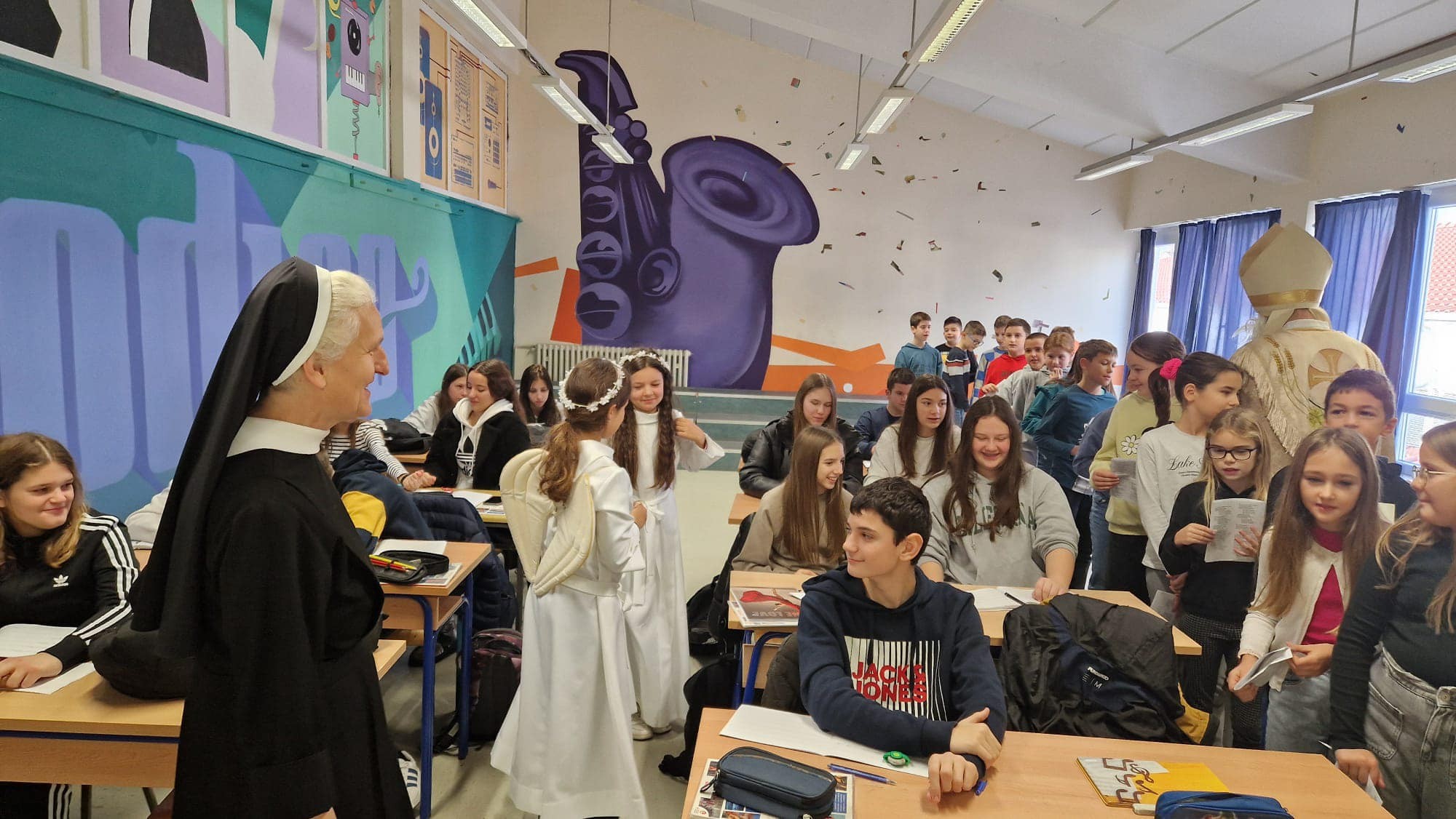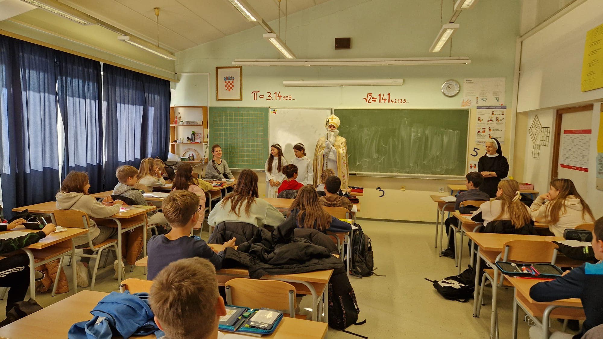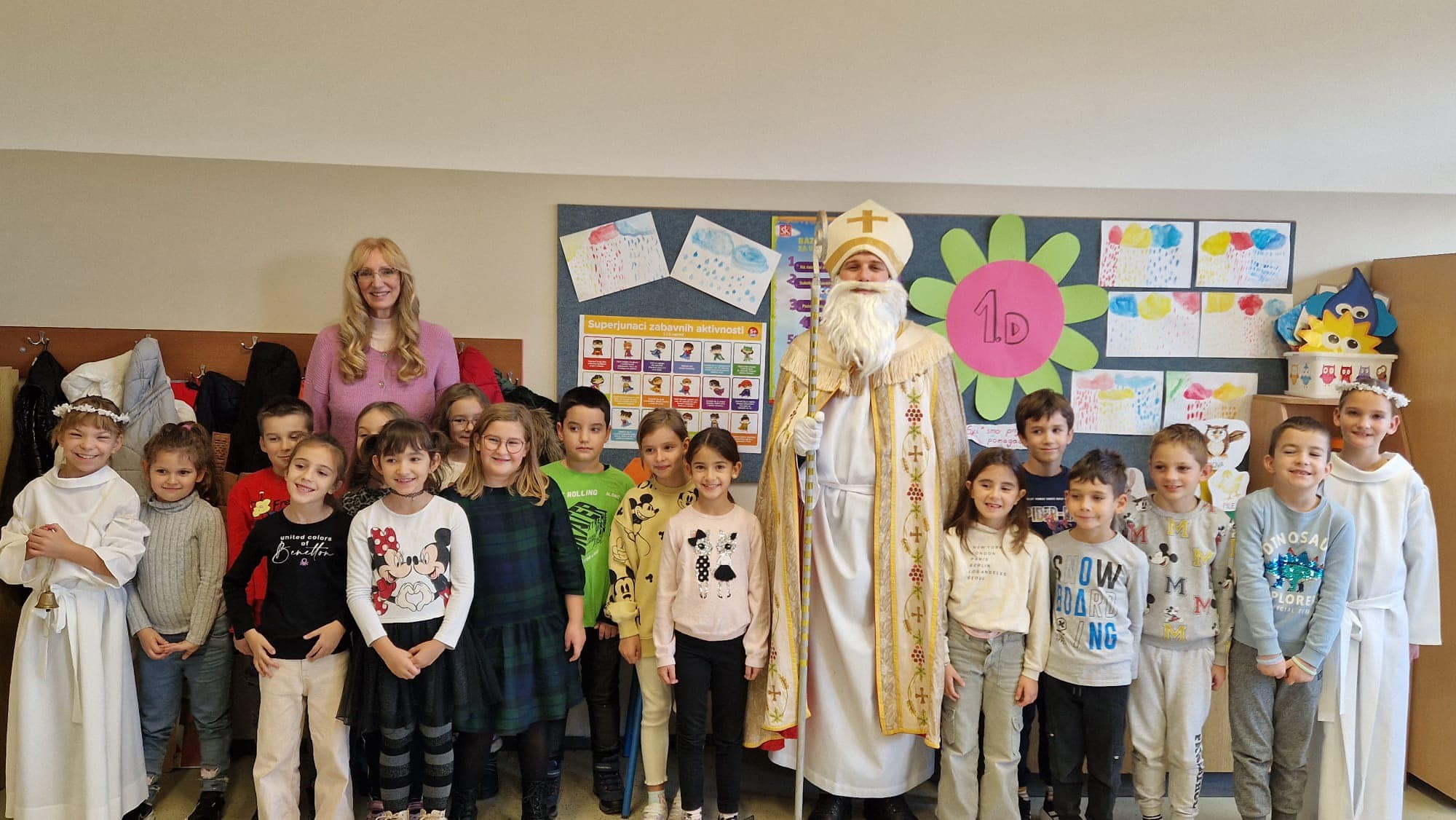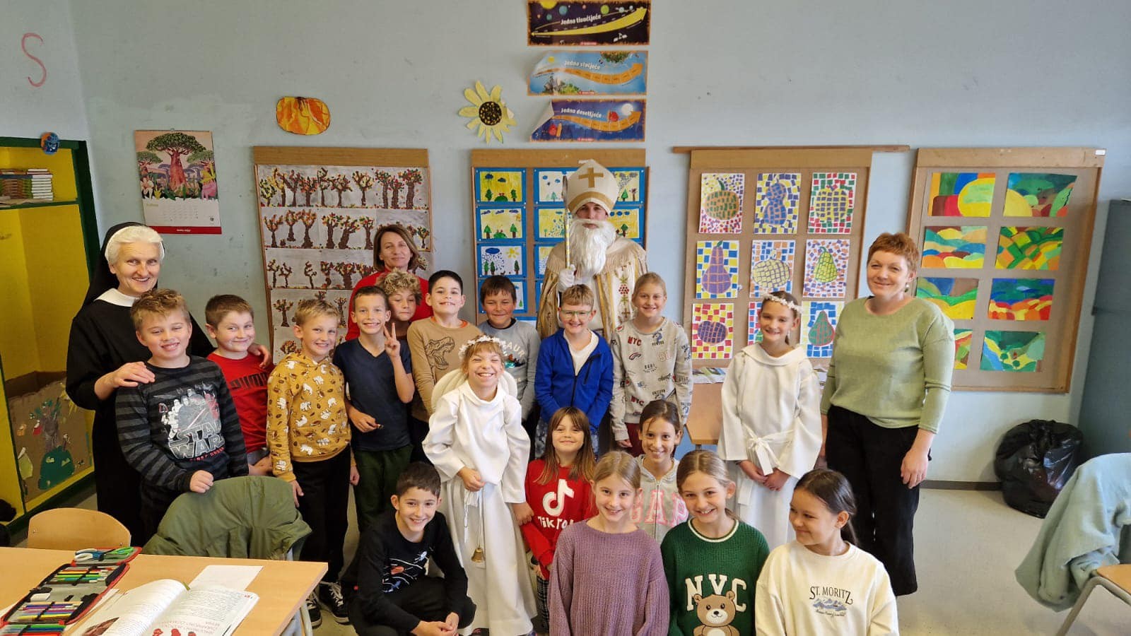 U jutarnjim satima, Sveti Nikola, u pratnji anđela i časne sestre Klare, prošetao je hodnicima škole, zaustavljajući se u učionicama kako bi podijelio male poklone svim učenicima. Djeca su s oduševljenjem dočekala svog posebnog gosta, čestitali su mu imendan i radosno sudjelovali u interakciji s njim. Odgovarali su na njegova pitanja, pjevali mu pjesme i veselo se fotografirali s njim, čime su stvorili nezaboravne uspomene.