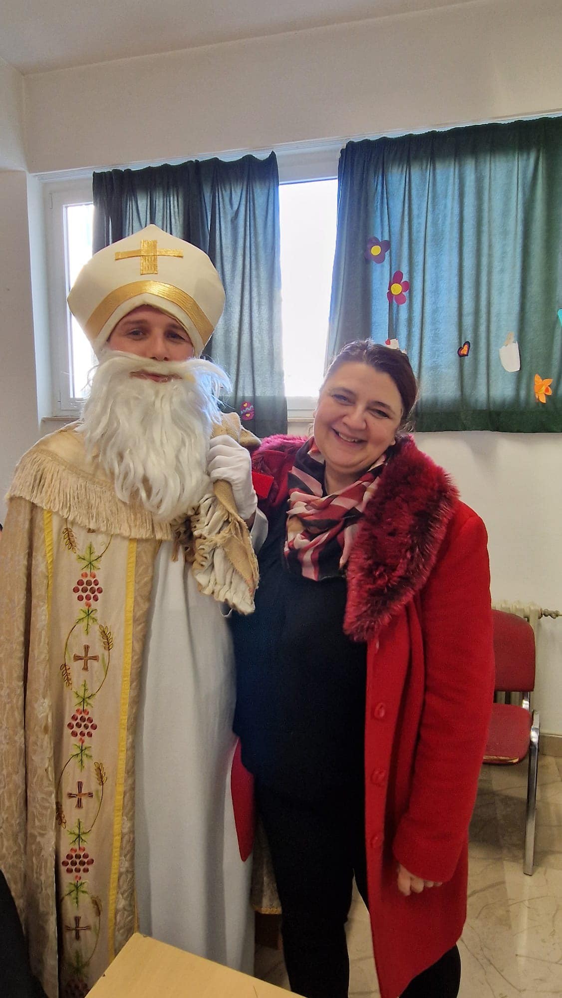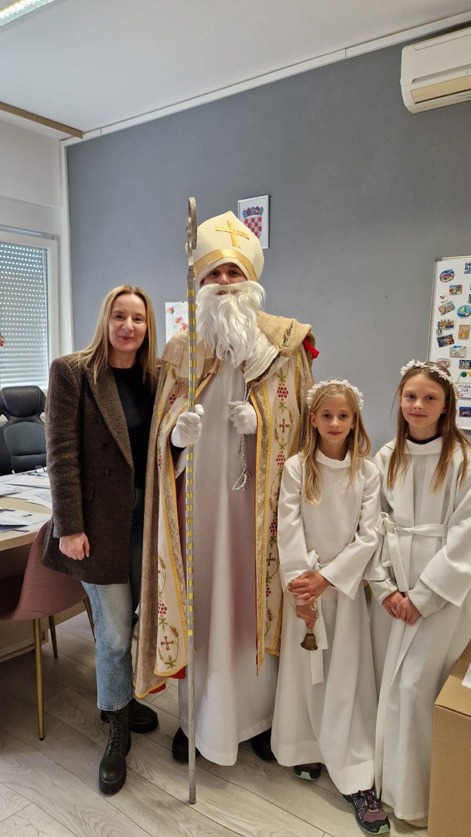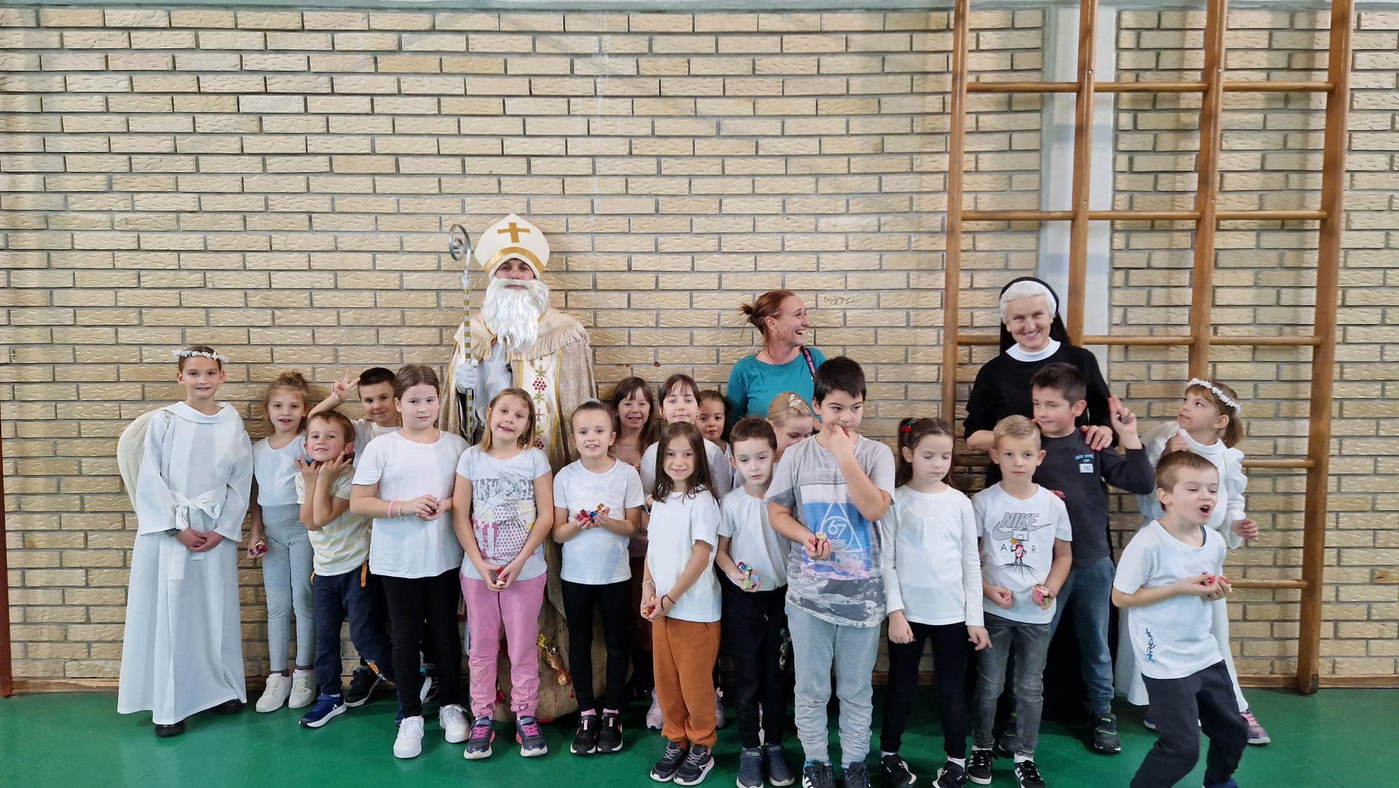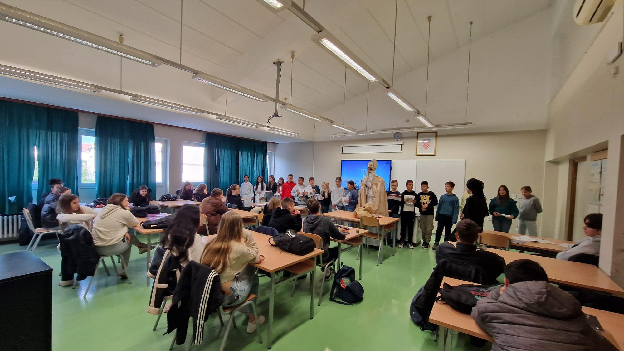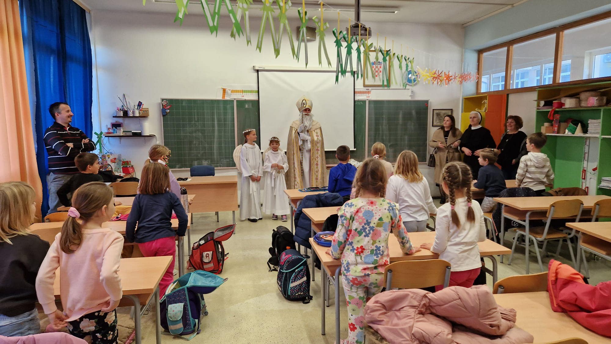 U jutarnjim satima, Sveti Nikola, u pratnji anđela i časne sestre Klare, prošetao je hodnicima škole, zaustavljajući se u učionicama kako bi podijelio male poklone svim učenicima. Djeca su s oduševljenjem dočekala svog posebnog gosta, čestitali su mu imendan i radosno sudjelovali u interakciji s njim. Odgovarali su na njegova pitanja, pjevali mu pjesme i veselo se fotografirali s njim, čime su stvorili nezaboravne uspomene.