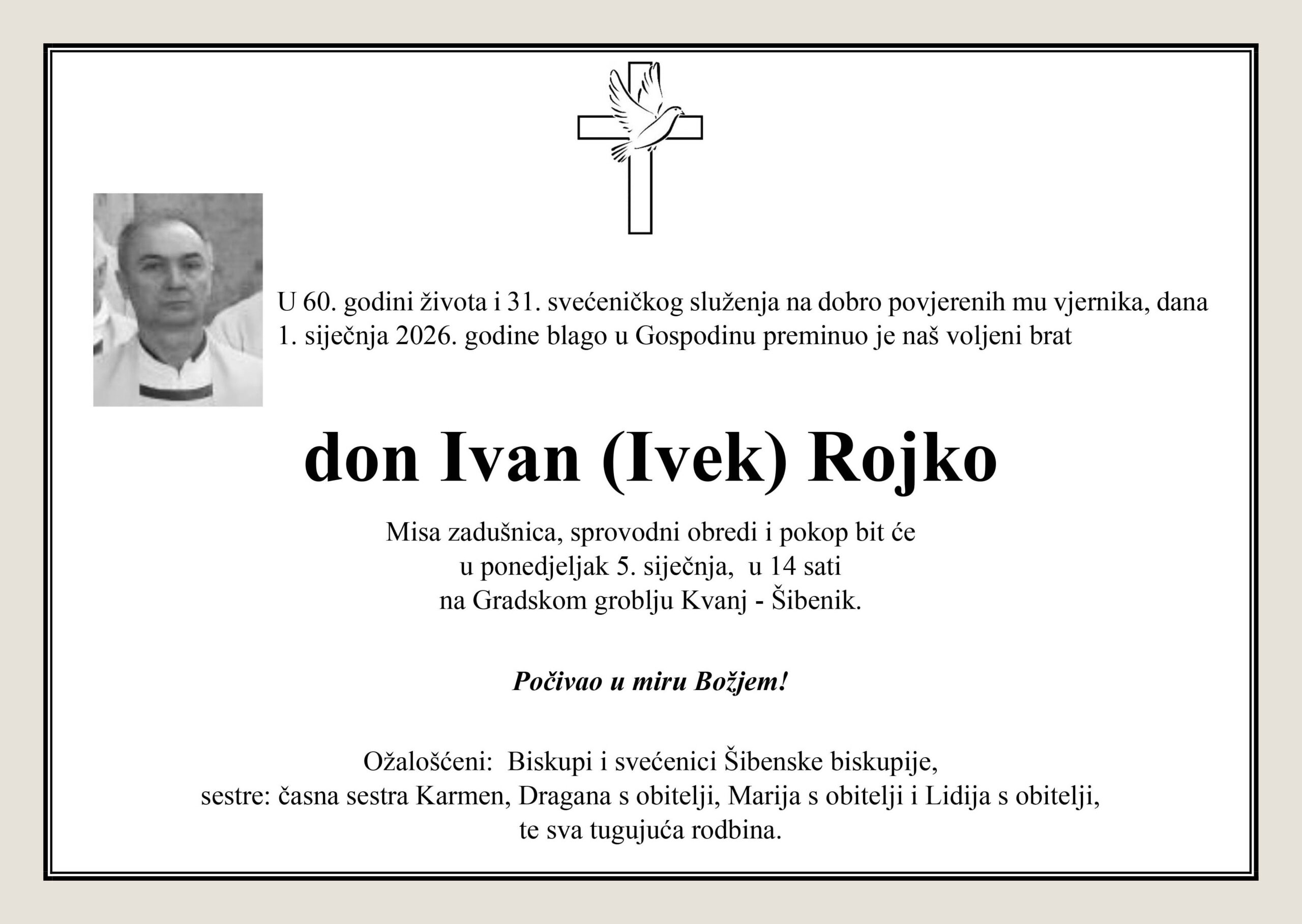 Misa zadušnica, sprovodni obredi i pokop don Ivana (Iveka) Rojka bit će u ponedjeljak, 5. siječnja, u 14 sati na Gradskom groblju Kvanj u Šibeniku.