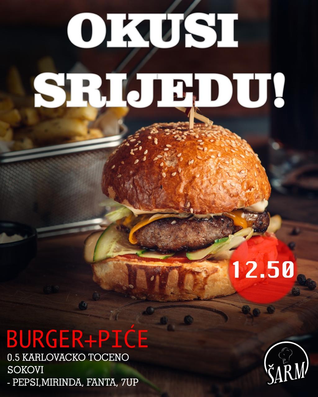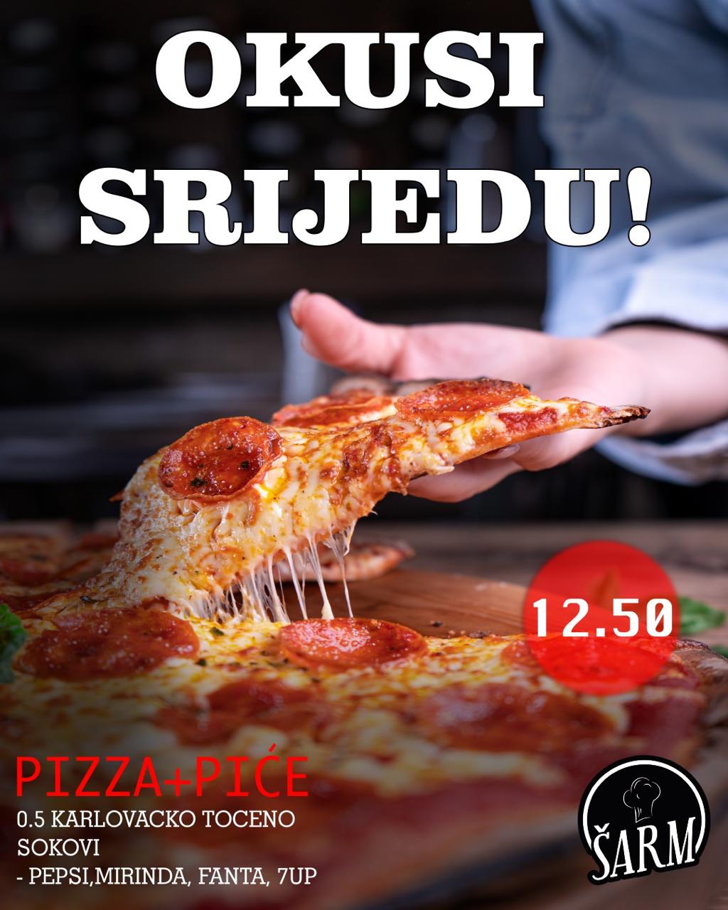 Sredina tjedna zaslužuje poseban okus. Ove srijede u restoranu Šarm očekuje vas odlična ponuda - za samo 12,50 €: bilo koja pizza ili burger + 0,5 l točenog Karlovačkog ili sok po izboru (Pepsi, Mirinda, Fanta, 7up).