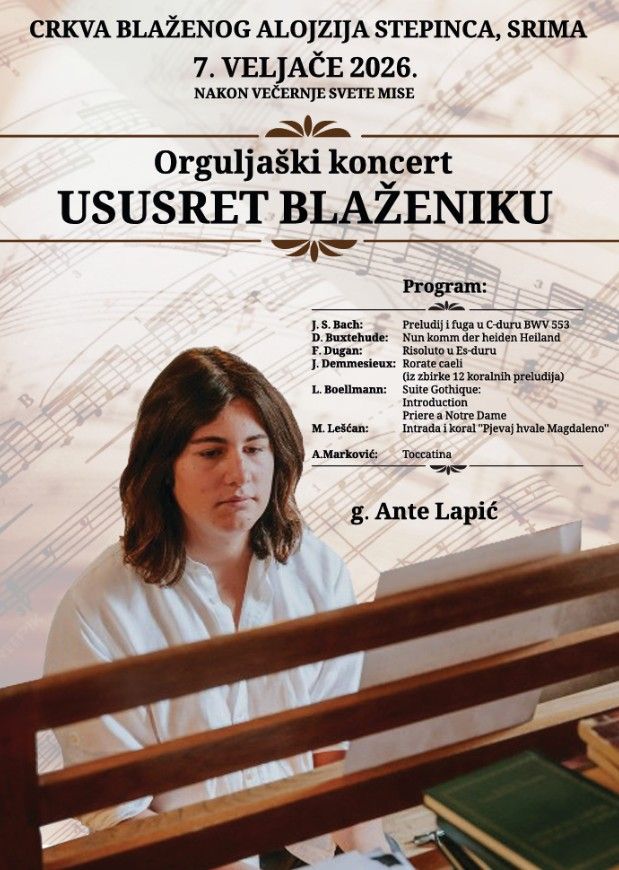 Crkva blaženog Alojzija Stepinca u Srimi bit će domaćin orguljaškog koncerta „Ususret blaženiku“ koji će se održati u subotu, 7. veljače 2026., nakon večernje svete mise.