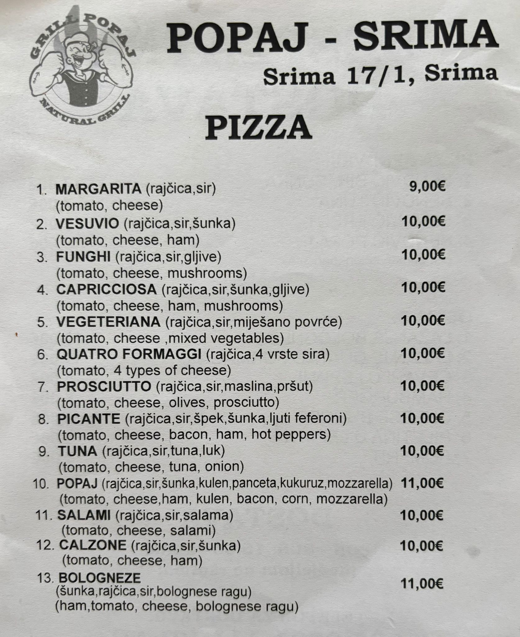 Popaj Srima nudi bogat izbor pizza po originalnim recepturama, među kojima se ističu popularne Popaj, Capricciosa, Bolognese i Quattro Formaggi, a tu su i sendviči, lazanje, hamburgeri, ćevapi i piletina u lepinji – sve po pristupačnim cijenama. Dostava je, kao i uvijek, besplatna.