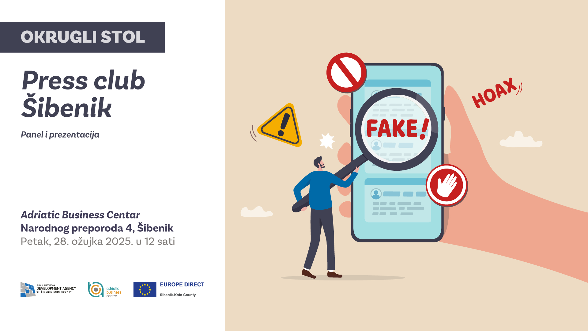 U organizaciji Europe Direct Centra i u suradnji s medijima, u Šibeniku se održava posebno izdanje Press kluba, posvećeno aktualnim izazovima informiranja mladih i jačanju prisutnosti europskih tema u lokalnom prostoru. Događaj će se održati ovog petka, 28. ožujka s početkom u 12 sati u Adriatic Business Centru. Više saznajte u nastavku.