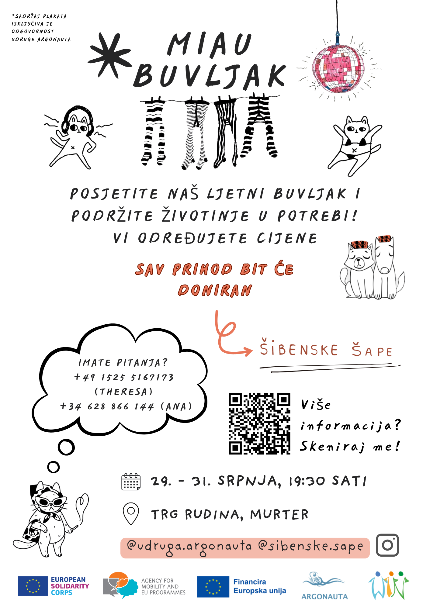 ESS volonterke udruge Argonauta i Turistička zajednica Murter – Kornati, uz podršku Općine Murter – Kornati, stavljaju Murter u središte zbivanja! Od 29. do 31. srpnja, svakog dana od 19:30 sati, na Trgu Rudina održava se MIAU buvljak – humanitarni second-hand sajam za prikupljanje pomoći napuštenim životinjama.