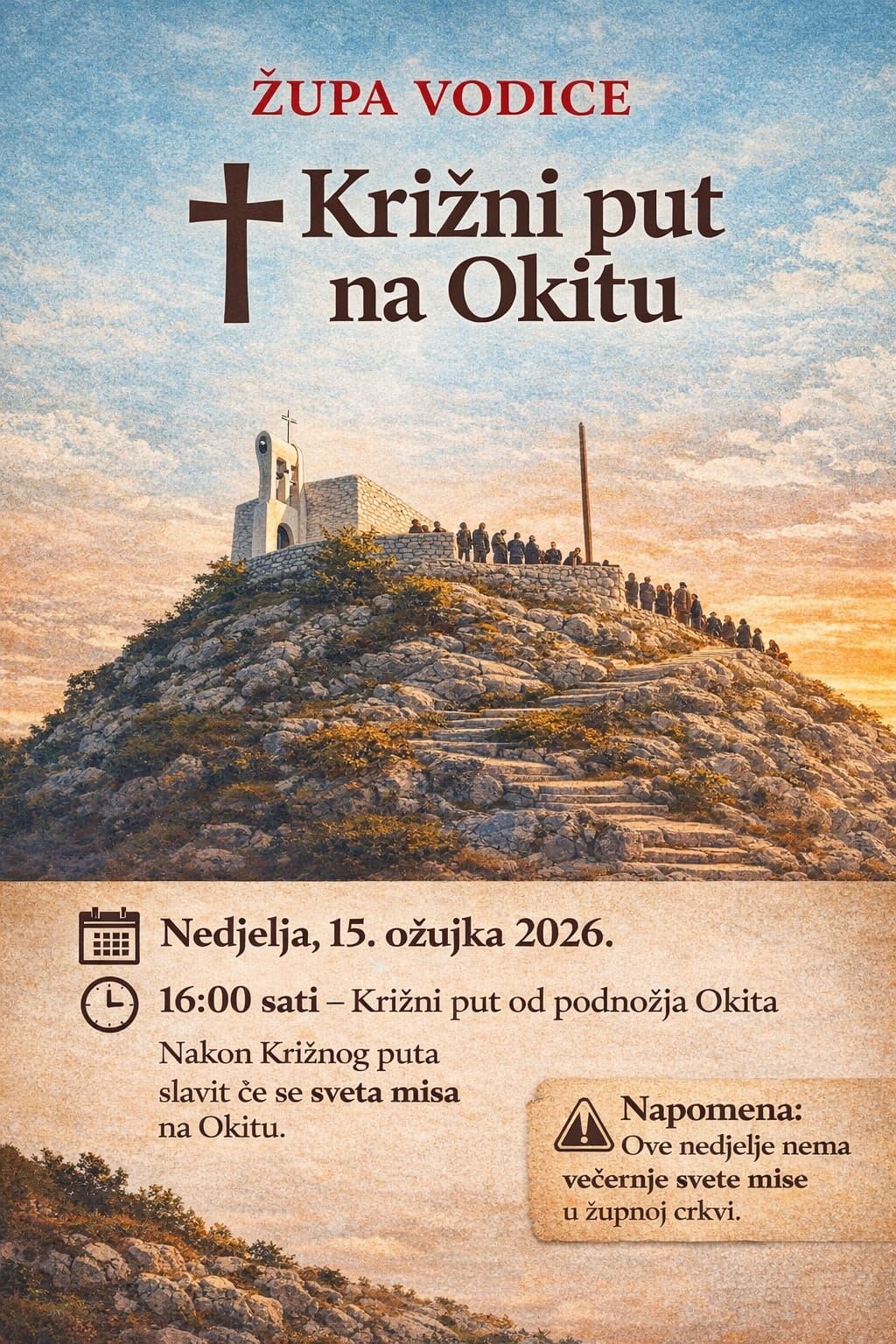 Župa Našašća sv. Križa Vodice u nedjelju, 15. ožujka 2026. godine organizira tradicionalni Križni put na Okitu, na koji su pozvani svi vjernici i hodočasnici.
