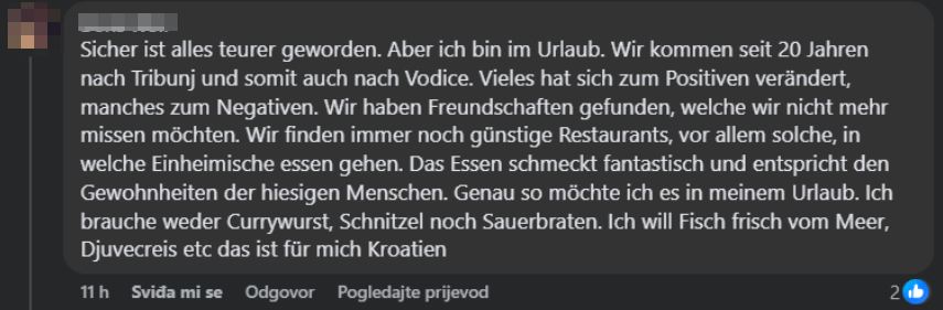 S druge strane, dio gostiju naglašava da se još uvijek može pronaći dobra i autentična ponuda, pogotovo ako se makne od glavnih “turističkih točaka”. Tamo gdje jedu domaći, kažu, još uvijek postoje korektne cijene i kvalitetna hrana. “Ne trebam currywurst ni šniclu – tražim ribu i đuveč. To je za mene Hrvatska”, napisala je jedna dugogodišnja gošća iz Njemačke koja već 20 godina ljetuje u Tribunju i Vodicama.