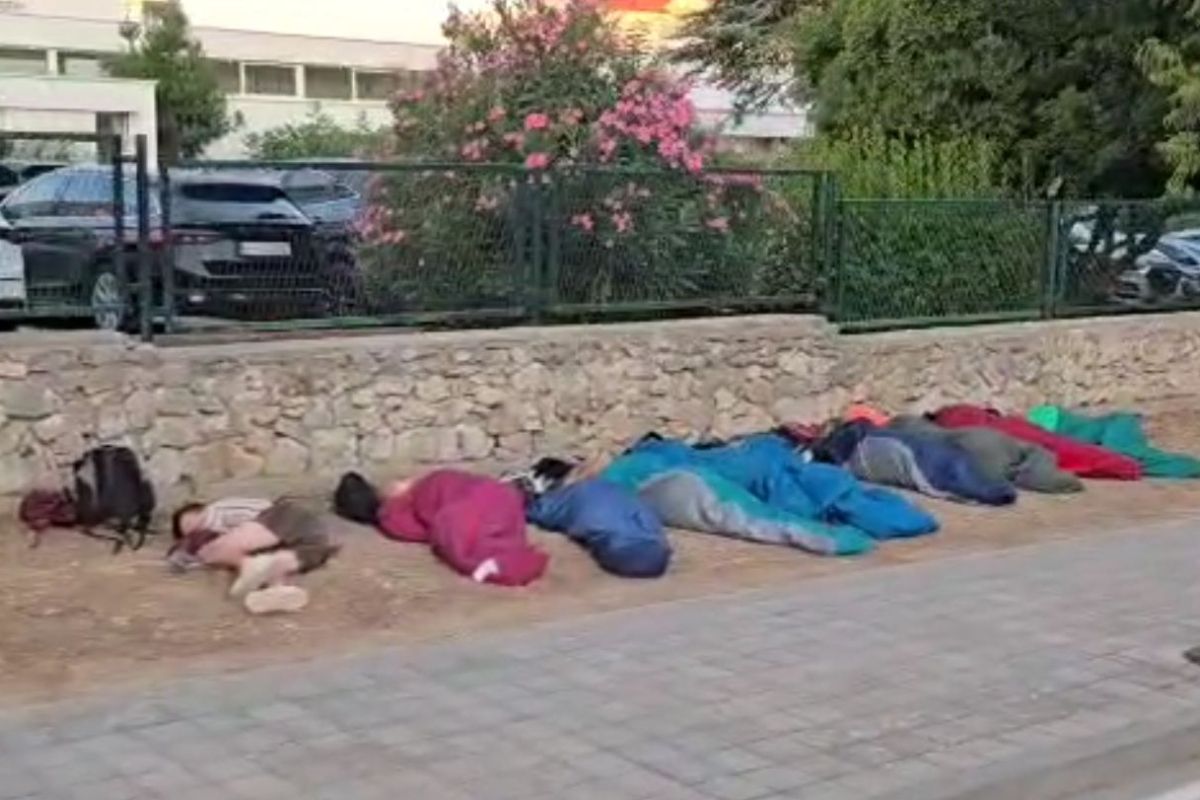 Prolaznici koji su se jutros zatekli na cesti kod jednog vodičkog hotela mogli su svjedočiti nesvakidašnjoj slici – uz kameni zid, na uskom pojasu zemlje između nogostupa i parkirališta, ležalo je desetak mladih osoba, svaki u svojoj vreći za spavanje.