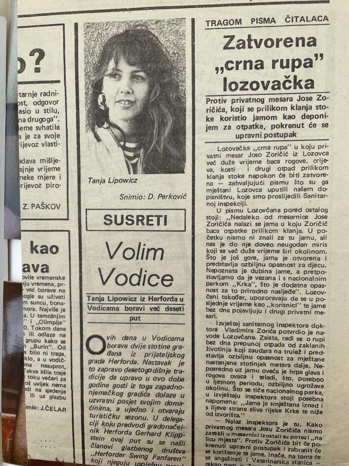 - U Vodice sam došla prvi put kada sam imala 13 godina s tadašnjim herfordskim orkestrom. Bilo je to 1979. godine. Svirala sam trubu. Došli smo autobusom i na ulici smo susreli jednu staricu obučenu u crno koja je jahala na magarcu. Nikog osim nje nije bilo na ulici. Bili smo začuđeni i ptali smo se gdje smo mi to došli, kakvo je to mjesto. Kada je vozač skrenuo autobus iza malog ugla, cijelo "Selo" nas je dočekalo ispred bivšeg restorana Kozare i zasvirala je Vodička glazba. Unutarnji dio restoran je bio ukrašen. Na stolovima su bili kolači, torte, krafne, prošek, rakija... Bilo je super i nikad neću zaboraviti ovu dobrodošlicu – prisjeća se Tanja Lipowicz.