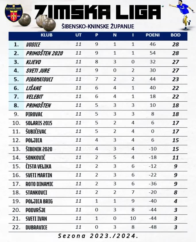 Završeno 11. kolo zimske boćarske lige: Vodice i dalje vodeće na ljestvici