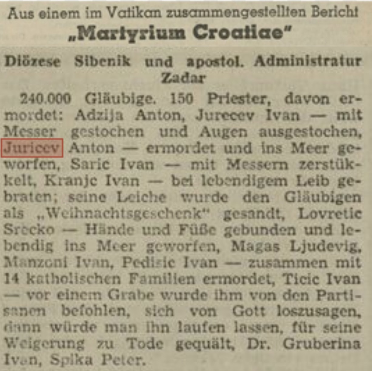 Tijekom i nakon II svj. rata pobijeno je bez suđenja više od šesto hrvatskih svećenika i jedan (umirovljeni) biskup Josip Marija Carević. Tako su stradali i vodički svećenici: don Ante Juričev Polica, fra Dionije Juričev, fra Felicijan Fržop i mladi bogoslov Martin Mačukat koga je vlastiti ujac partizan tražio u zagrebačkim kazamatima 1945.g. i odatle odveo na stratište na Jazovku.