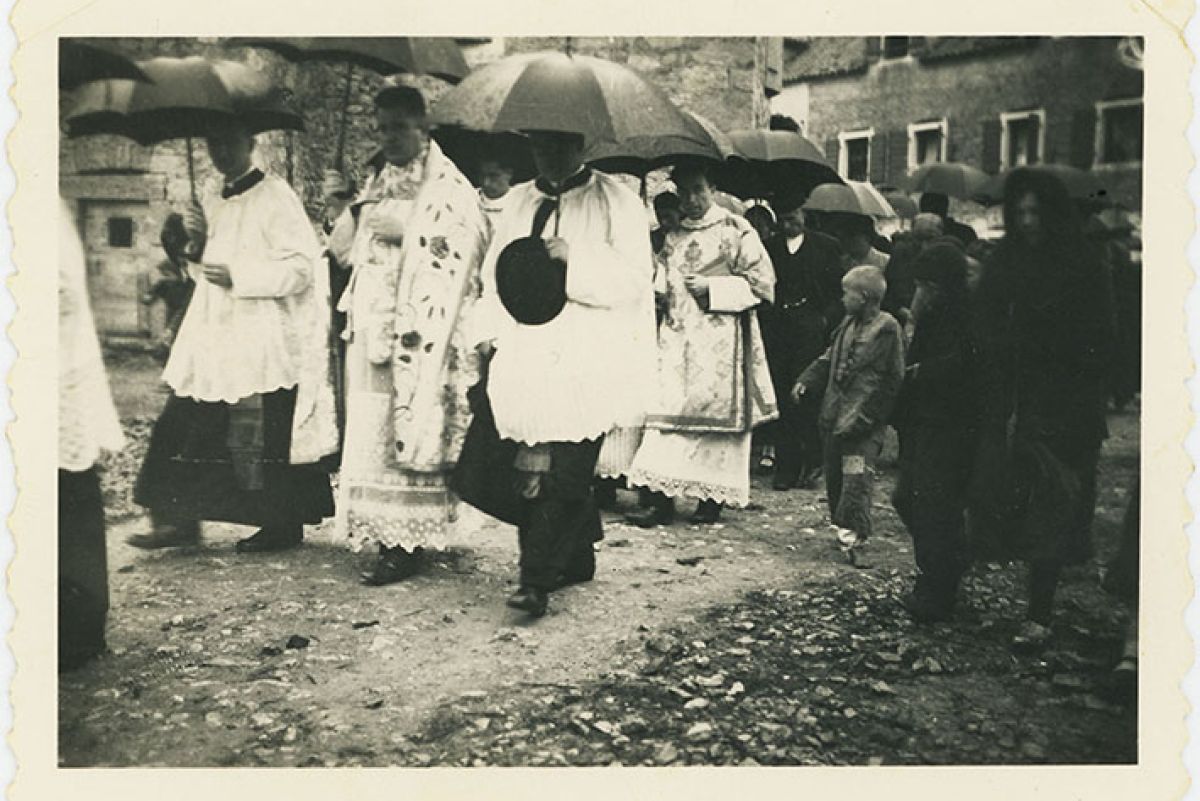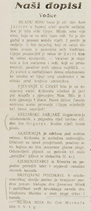 Svečani ispraćaj iz rodne kuće don Ante Juričev Police na Mladu misu u Vodicama, svibanj 1937.g.