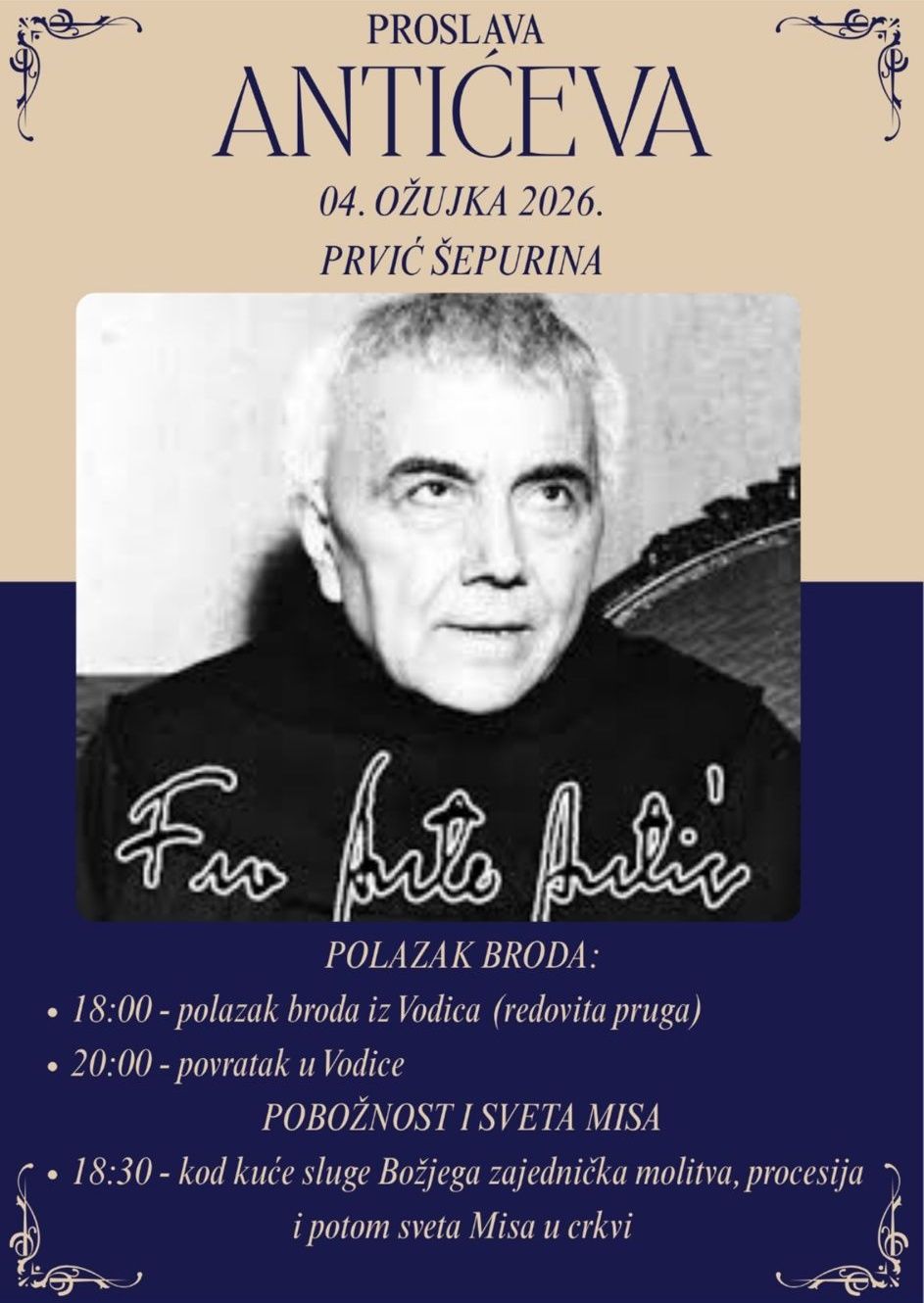 Pozivamo sve vjernike, štovatelje oca Ante Antića na proslavu spomendana sluge Božjega o. Ante Antića u Prvić Šepurini.
