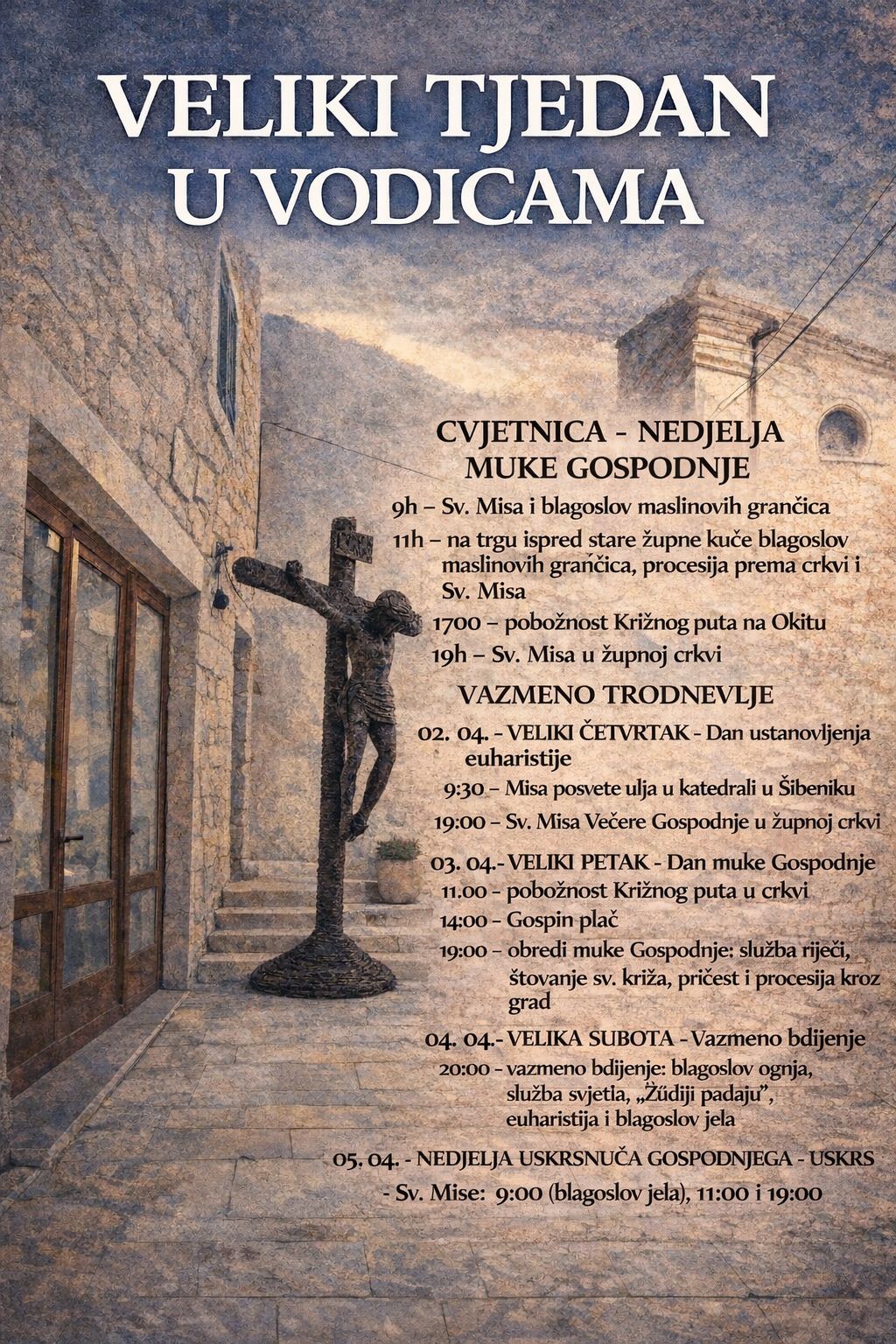 U Vodicama će se i ove godine obilježiti Veliki tjedan, razdoblje koje u kršćanskoj tradiciji ima posebno značenje, kroz niz liturgijskih slavlja, procesija i pobožnosti. Program započinje na Cvjetnicu, a završava na Uskrs, uz sudjelovanje brojnih vjernika i očuvanje dugogodišnjih običaja.