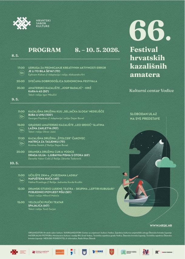 U organizaciji Hrvatskog sabora kulture i Centra za umjetnost i kulturu, 66. Festival hrvatskih kazališnih amatera održat će se u dva svibanjska vikenda – od 8. do 10. svibnja te od 15. do 17. svibnja 2026. godine.