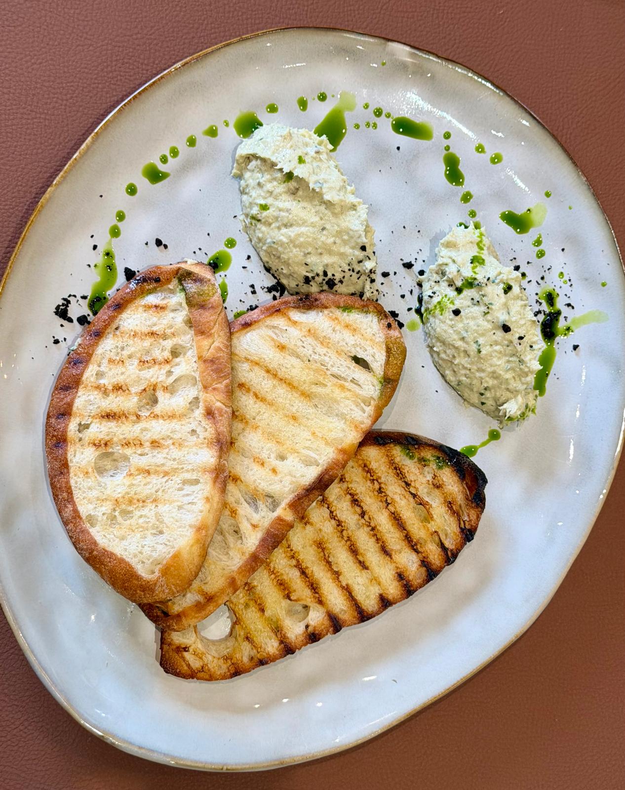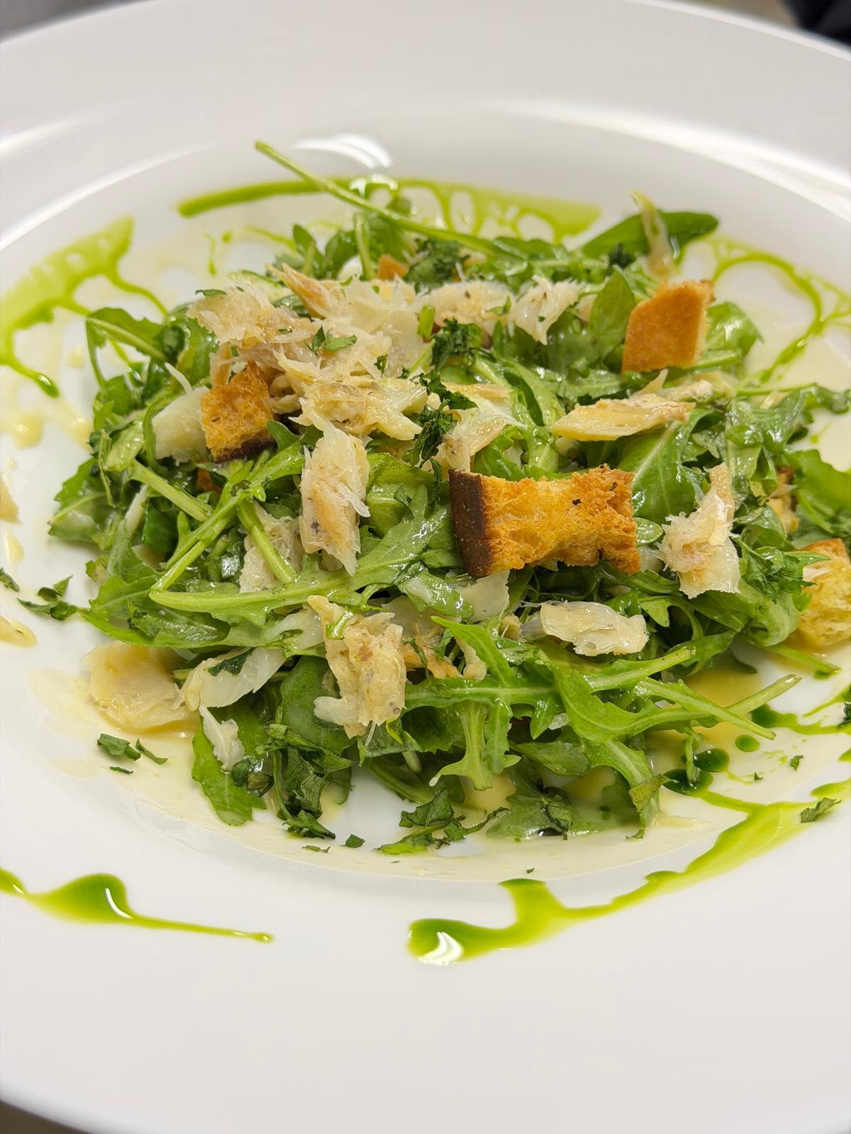 Predjelo: Salata od bakalara s emulzijom od pečenog češnjaka i citrusa te krutonima