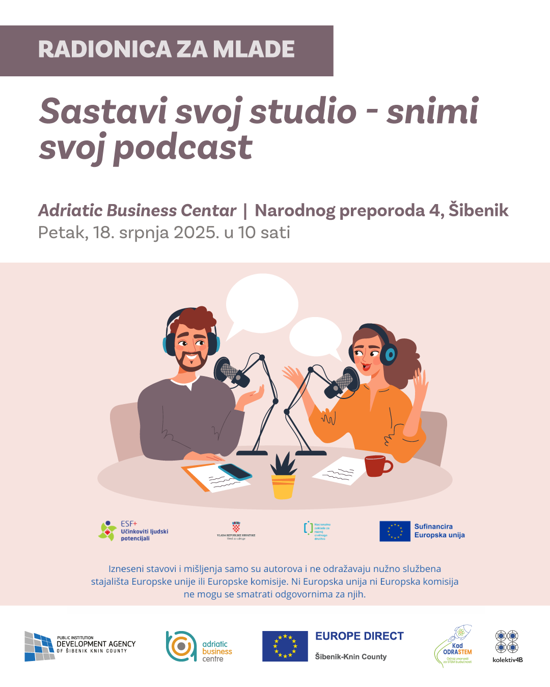 Radionica je namijenjena mladima u dobi od 12 do 15 godina koji žele zakoračiti u svijet medija, naučiti kako funkcionira podcast studio i snimiti vlastiti audio uradak. U trajanju od 2 sata, polaznici će kroz praktičan rad i stručnu podršku otkriti osnove zvuka, opreme i tehnika snimanja, a sve to u opuštenoj i poticajnoj atmosferi.