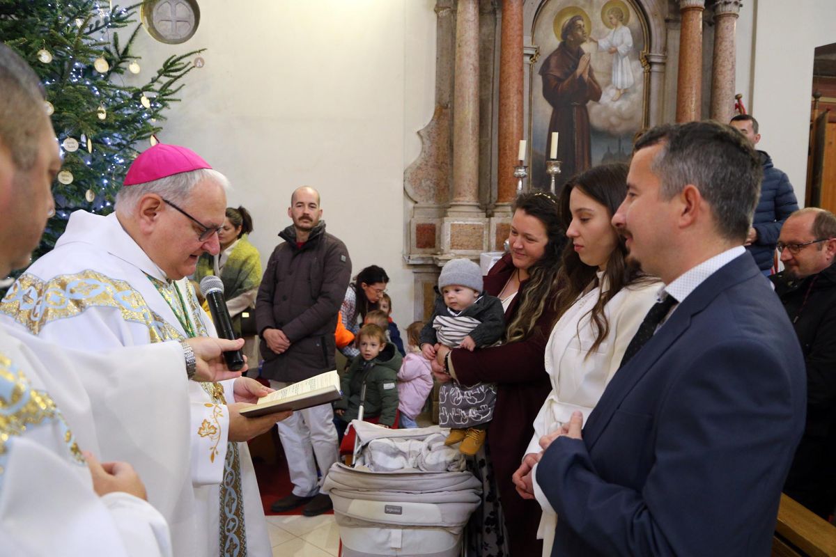 S tom vjerom pristupamo sada sakramentu krštenja. Roditeljima čestitamo dvostruko: najprije za otvorenost životu njihove obitelji, za pouzdanje u Boga s kojim su na svijet donijeli djecu. Čestitamo im što svoju djecu žele odgajati u vjeri, od malena Bogu posvetiti krštenjem da ih milost Božja kroz život vodi i brani, nadahnjuje i prati. Zapravo, što više roditelj može za dijete učiniti nego da ga s Bogom poveže i na Boga upućuje. Zahvaljujemo svi dobrome i svemogućem Bogu što u našem narodu još ima takvih obitelji. Bez njih nema nam budućnosti. Molimo danas Gospodina da zaštiti obitelj i dostojanstvo čovjeka kako ga je On stvorio i daruje našem hrvatskom narodi brojnih obitelji. Kad bude djece u našim kućama onda će svega biti: radosti – zadovoljstva – prave ljubavi, ako djece ne bude sve se pomalo gasi i gubi smisao i svaku vrijednost. Ustrajmo u molitvi, učvrstimo vjeru i radujmo se životu jer nas vodi u susret Sinu Božjemu, jer nas vodi u vječnost, poručio je biskup Tomislav Rogić u homiliji.